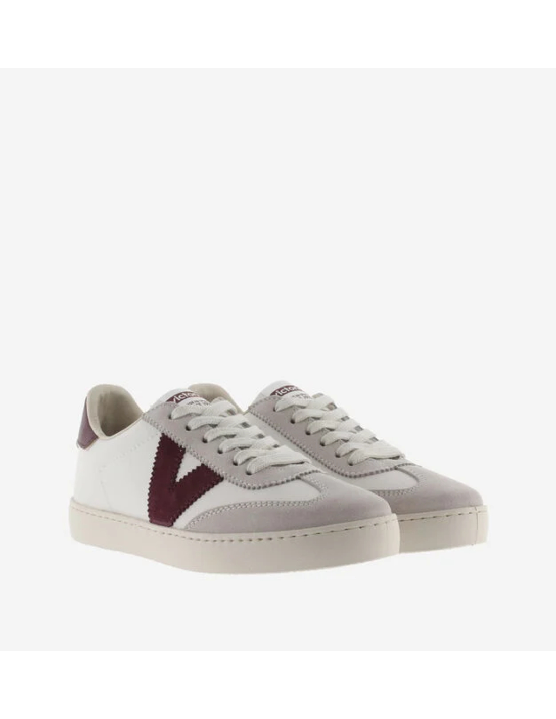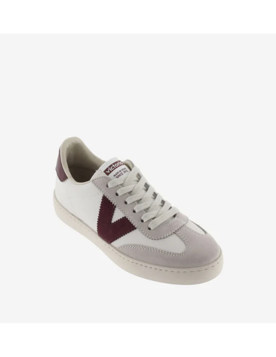 Zapatillas blancas unisex fabricadas en España en material efecto piel y piezas de serraje. Detalles de color en la V del lateral y la trasera, y nuevo corte ciclista en la puntera aportando estilo. Su suela ligeramente tostada está compuesta por aceites vegetales en lugar de minerales reduciendo así el impacto medioambiental. Además, incluyen una plantilla más ergonómica, confeccionada a partir de materiales reciclados, proporcionando un confort superior en cada paso.