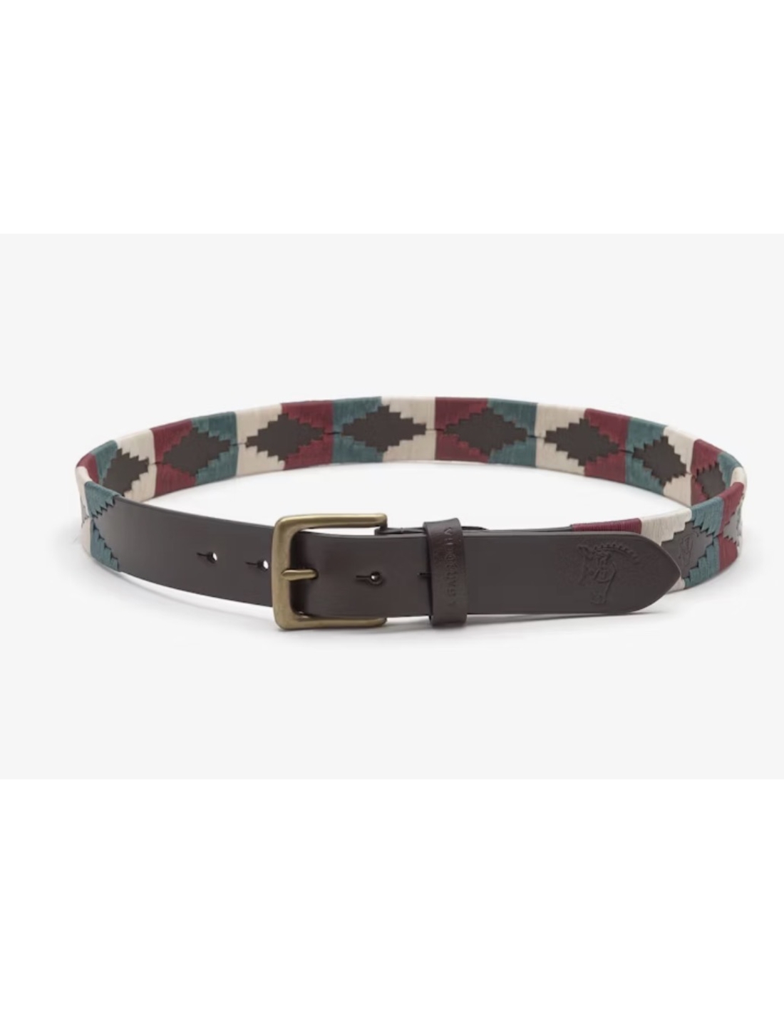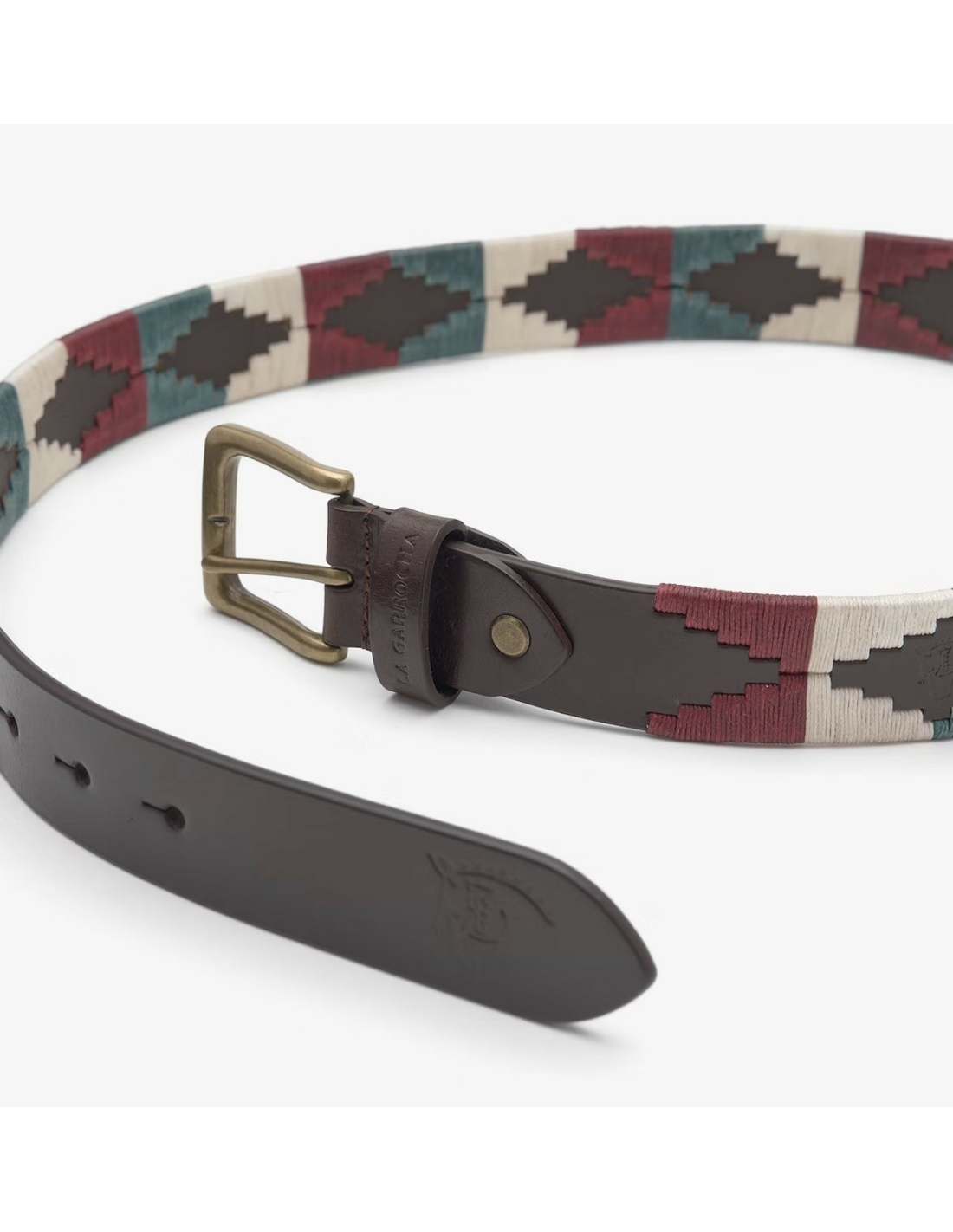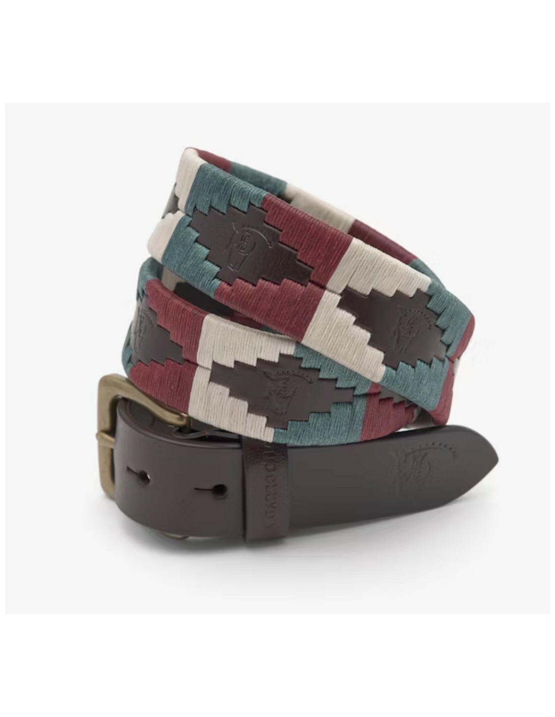Cinturón argentino confeccionado en piel de vacuno de primera calidad. Bordado con cordel de algodón encerado en tonos verdes. Cierre de hebilla metálica, pasador con grabado de La Garrocha y nuestro caballo grabado en el extremo.