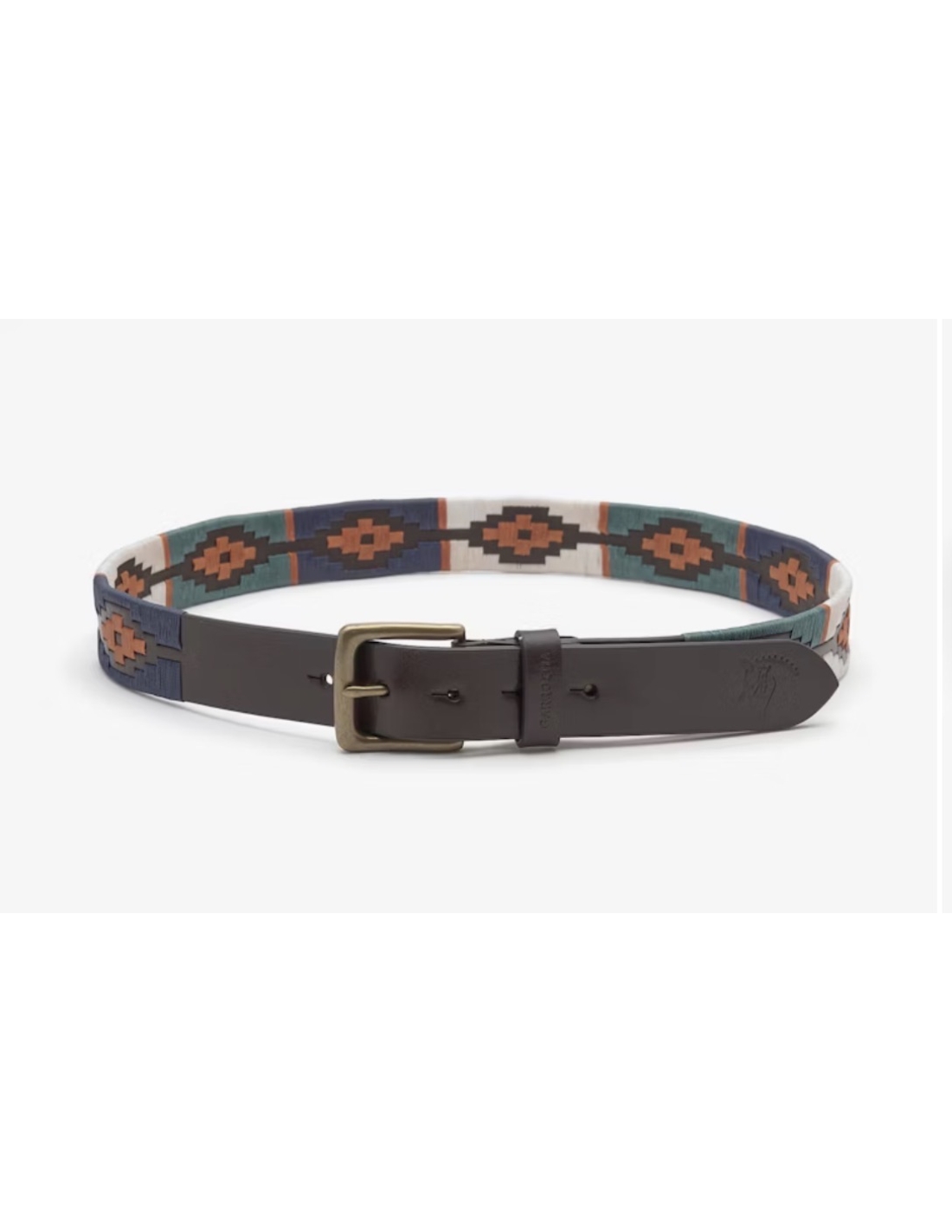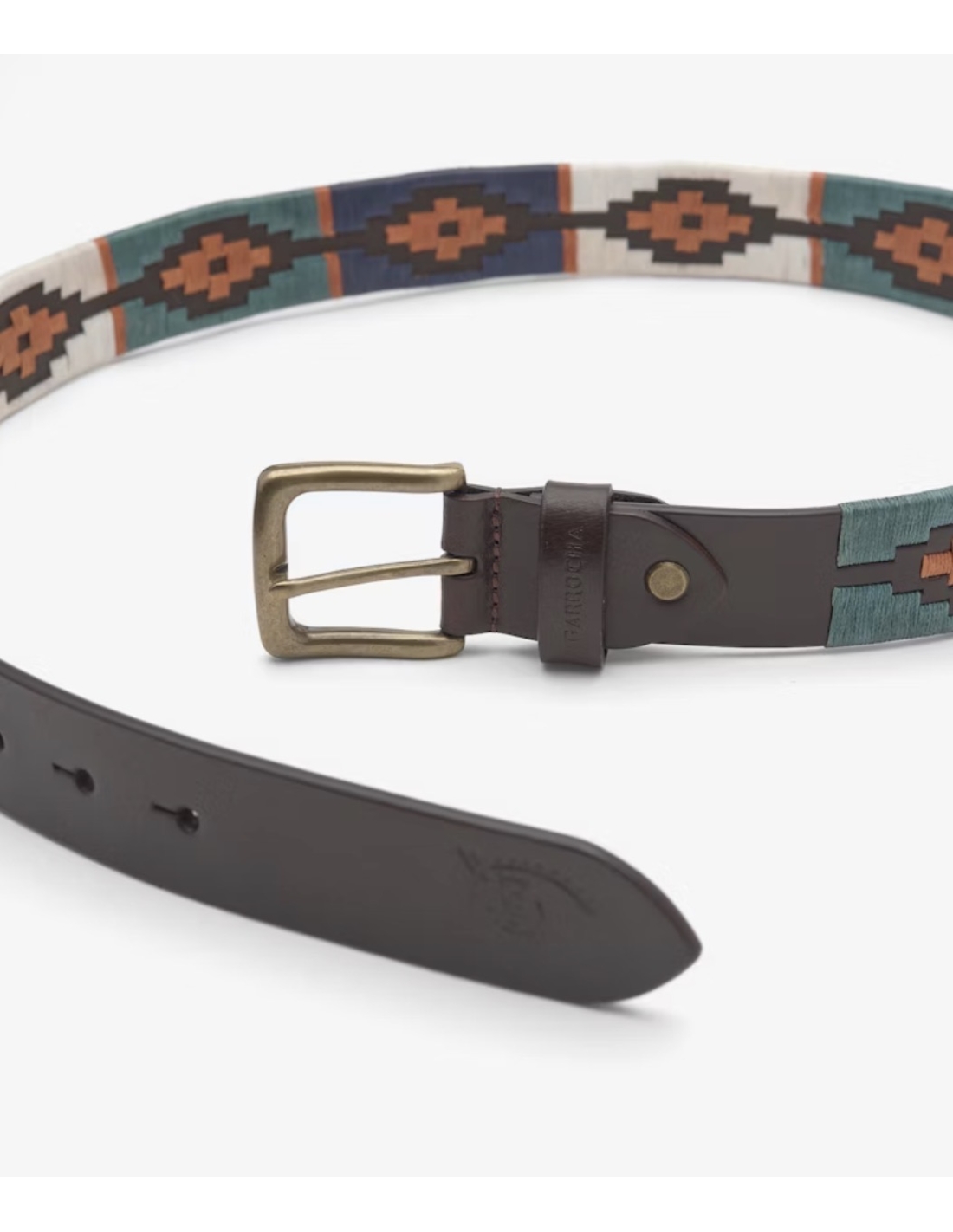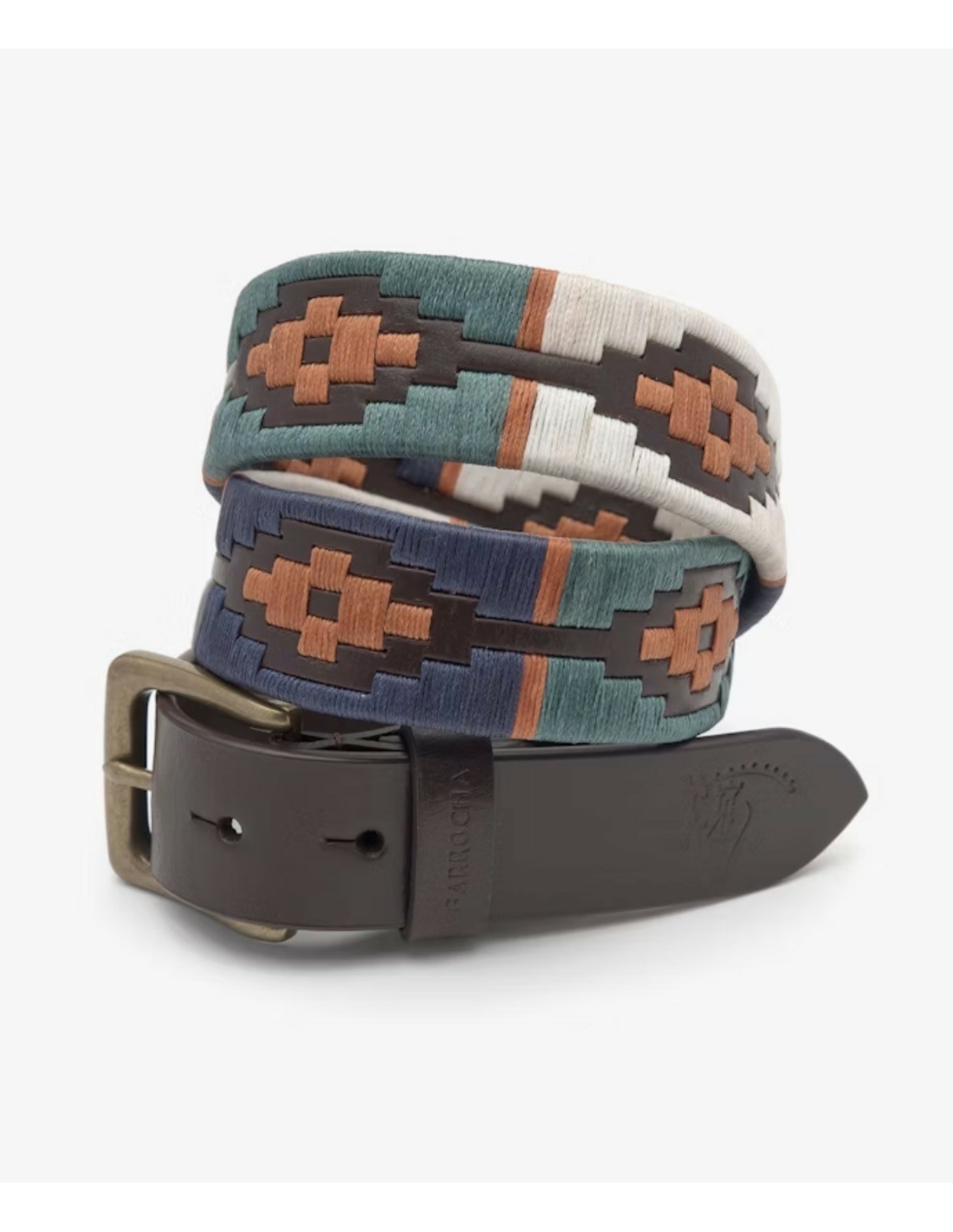 Cinturón argentino confeccionado en piel de vacuno de primera calidad. Bordado con cordel de algodón encerado. Cierre de hebilla metálica, pasador con grabado de La Garrocha y nuestro caballo grabado en el extremo.