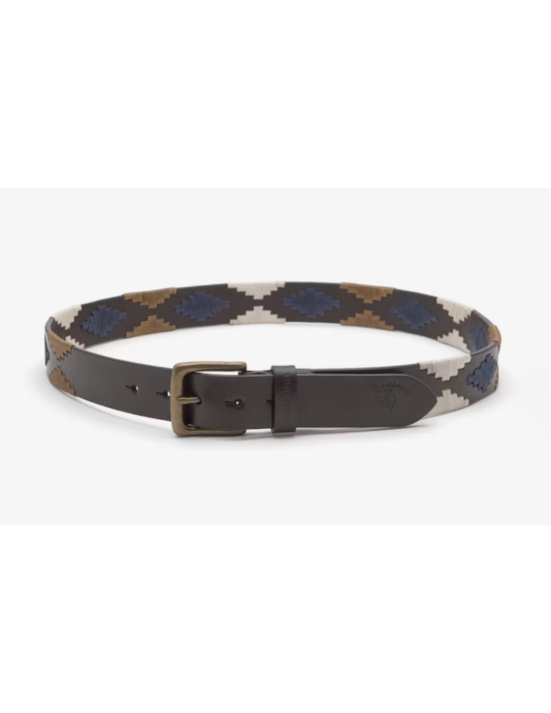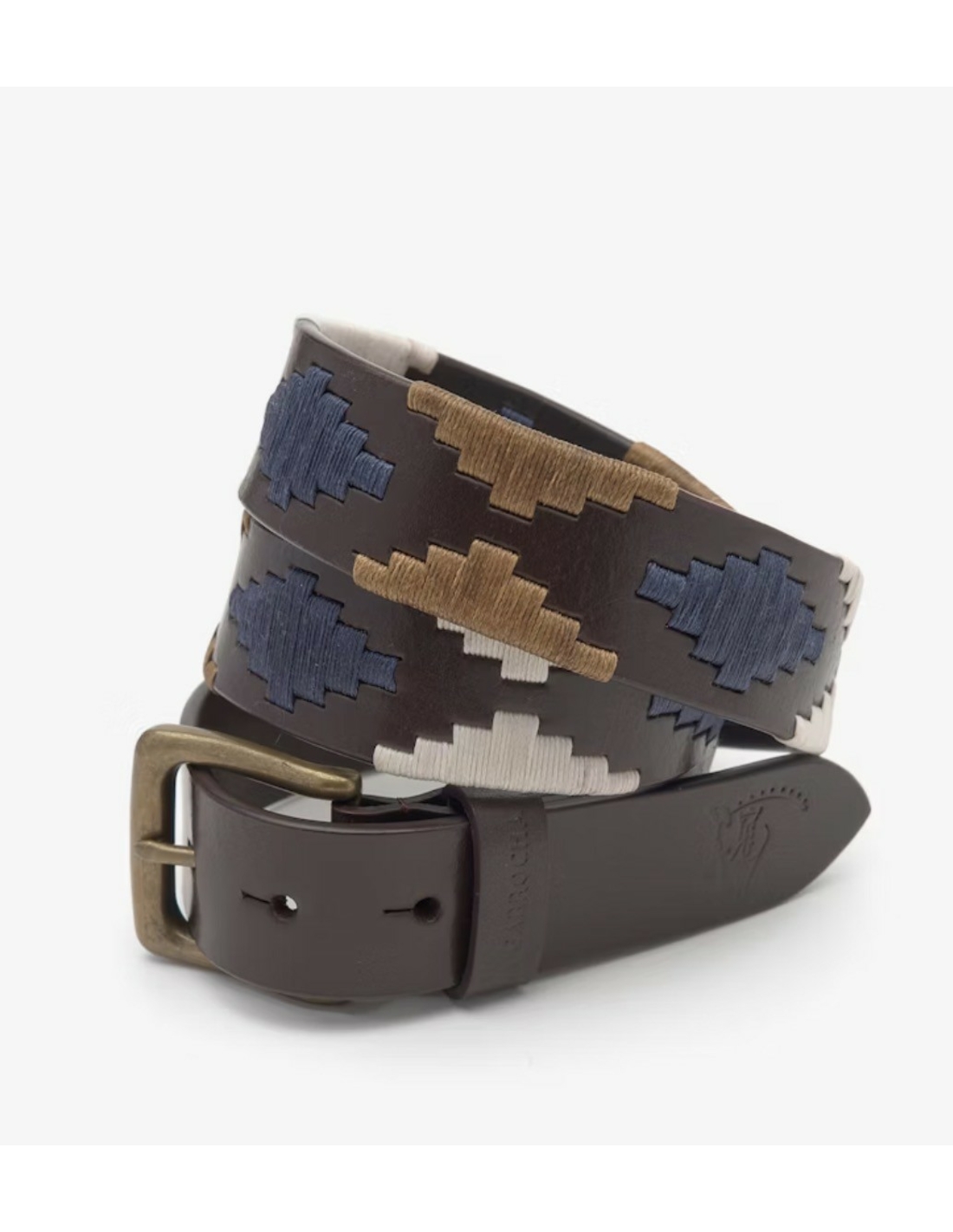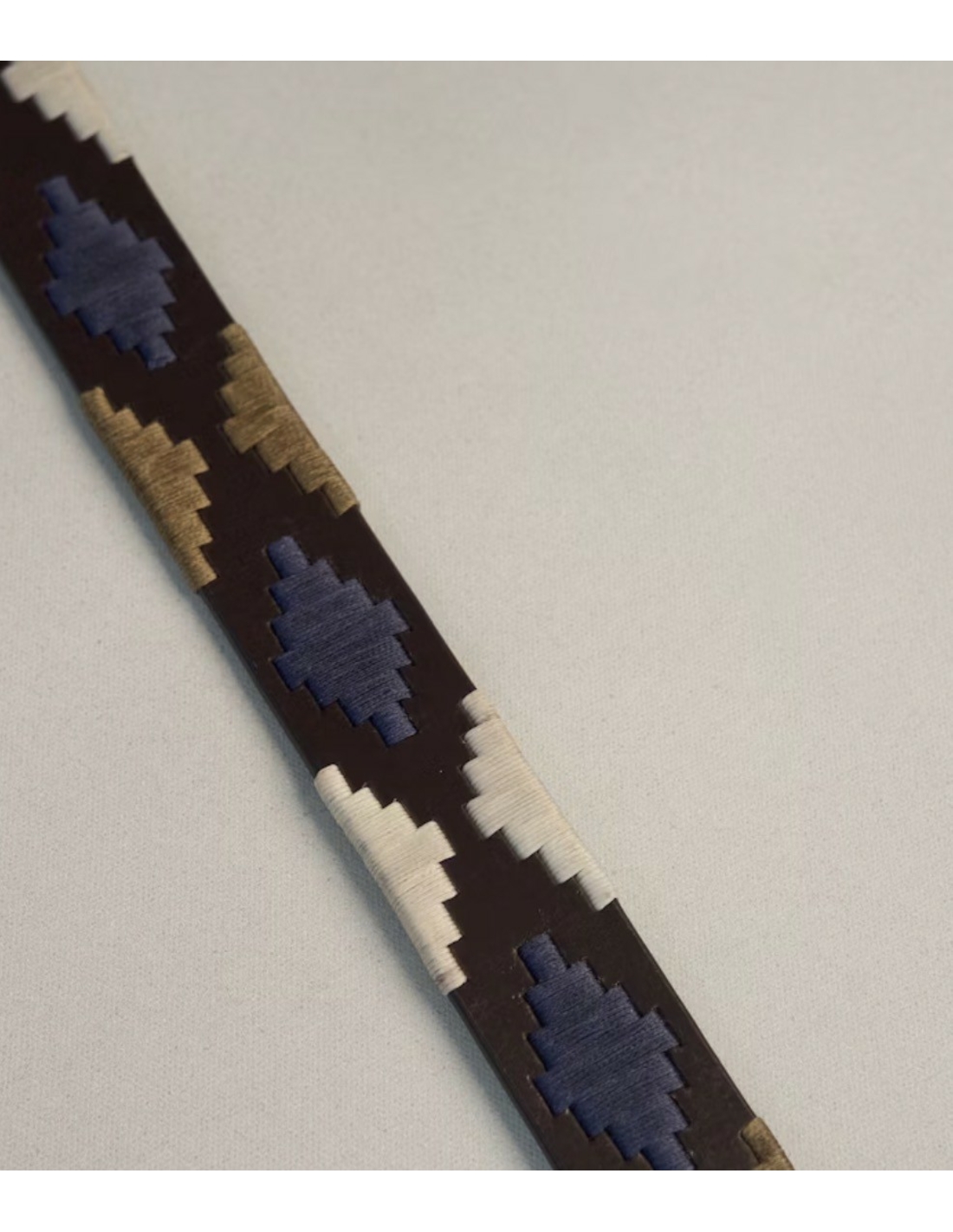 Cinturón argentino confeccionado en piel de vacuno de primera calidad. Bordado con cordel de algodón encerado en tonos marino. Cierre de hebilla metálica, pasador con grabado de La Garrocha y nuestro caballo grabado en el extremo.