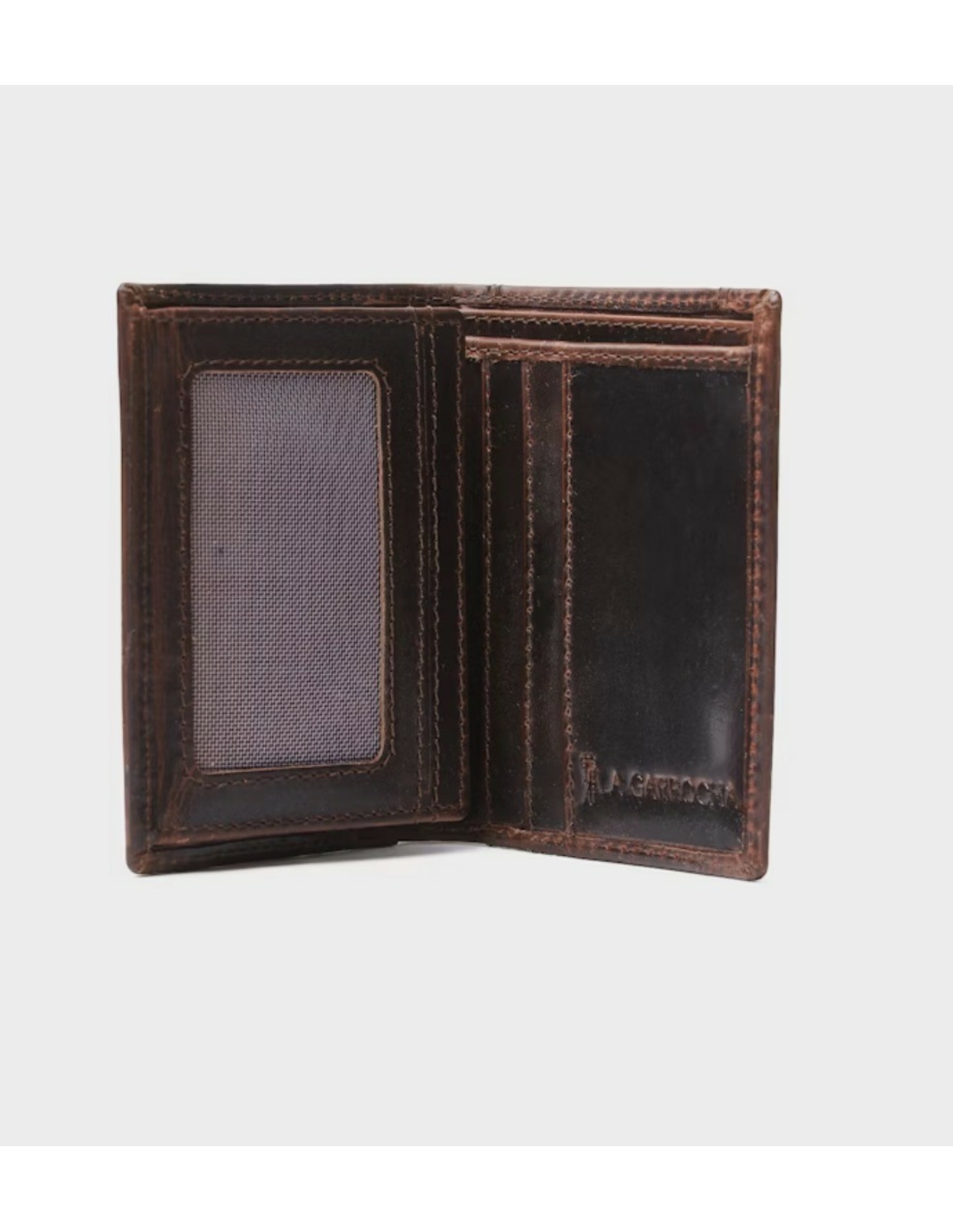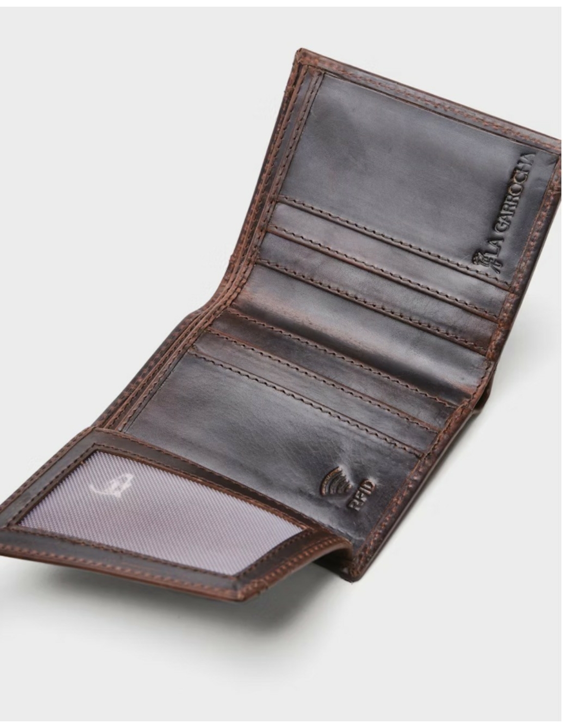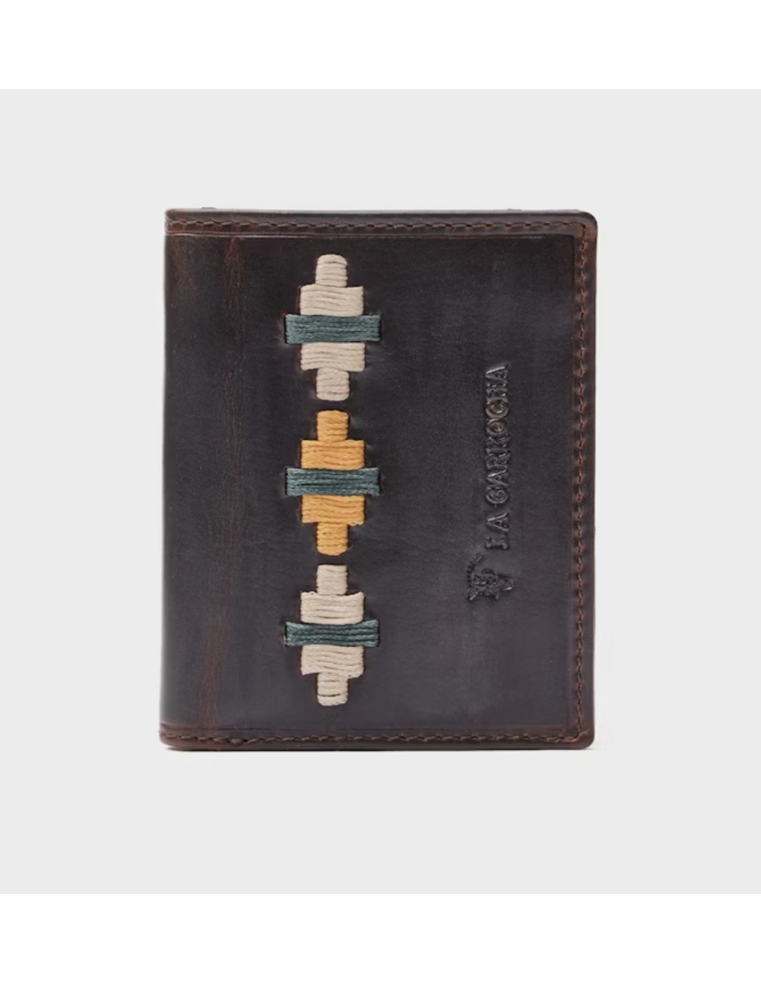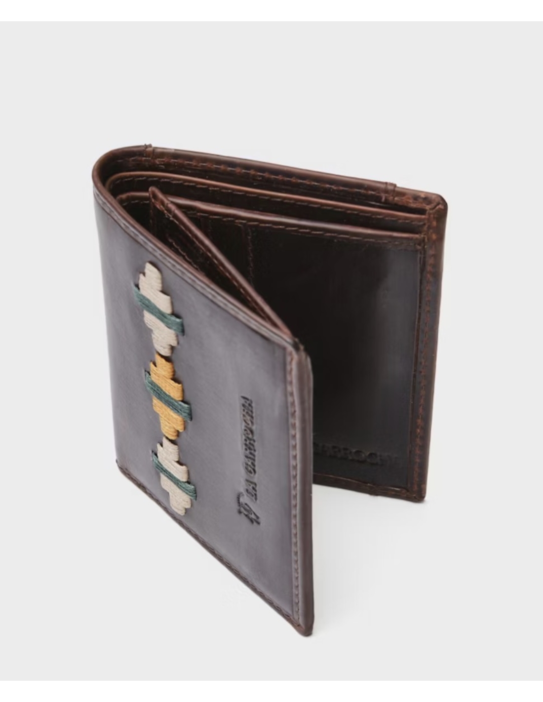 Cartera con bordados argentinos confeccionada en piel de vacuno engrasada y tintada en color chocolate. Consta de dos compartimentos para billetes o documentos, seis tarjeteros y cinco bolsillos. Emblema conmemorativo de la marca grabado en el exterior e interior. Dispone de sistema RFID, especial para la protección de tarjetas evitando así la posible copia o intentos de cargos.