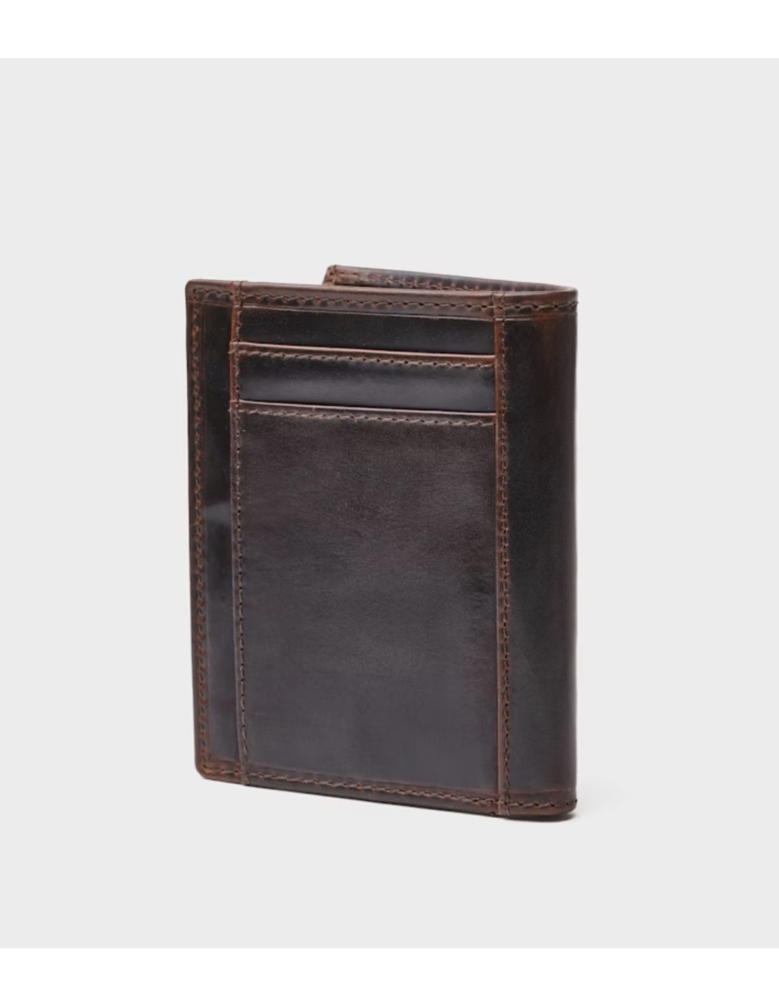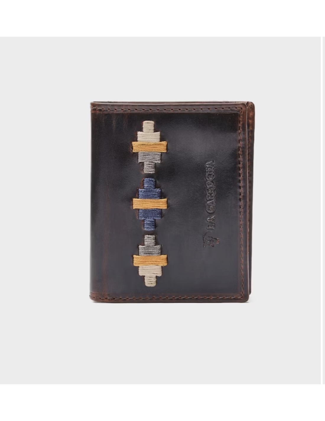 Cartera con bordados argentinos confeccionada en piel de vacuno engrasada y tintada en color chocolate. Consta de dos compartimentos para billetes o documentos, seis tarjeteros y cinco bolsillos. Emblema conmemorativo de la marca grabado en el exterior e interior. Dispone de sistema RFID, especial para la protección de tarjetas evitando así la posible copia o intentos de cargos.
