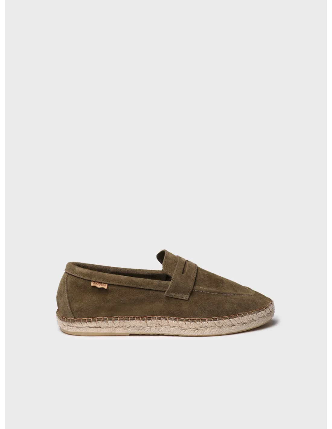 BENET. Esta alpargata cerrada para hombre se elabora en serraje. La suela es de yute y la base está hecha en goma antideslizante. La plantilla interior es de piel. Este diseño está cosido a mano en España.