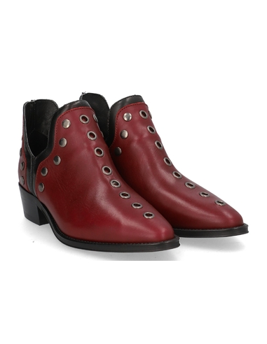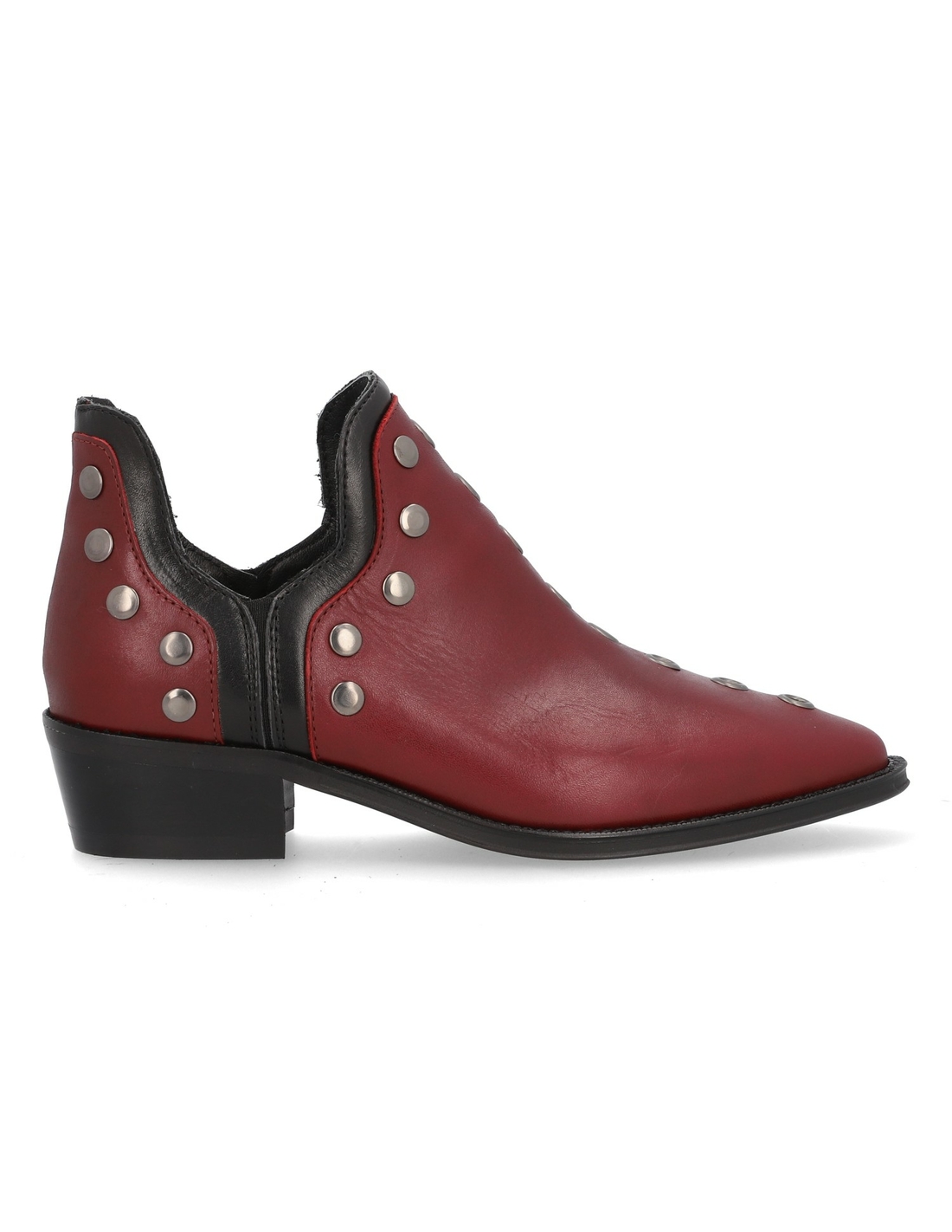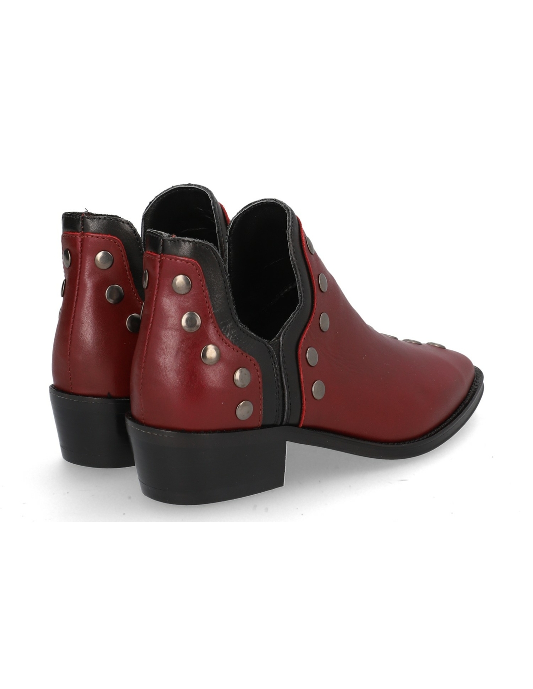 Botín de tachas ALPE CECILE hecho en piel ( becerro) de color burdeos con tacón de 4 cm, suela antideslizante y puntera afilada, sin cierre y caña baja.