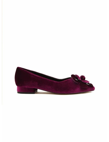 Disfruta de la delicadeza y el estilo con estas bailarinas de terciopelo buganvilla adornadas con encantadoras flores de tela. Este calzado bajo y cómodo no solo es perfecto para llevar durante largas horas, sino que también añade un toque romántico y sofisticado a cualquier outfit, haciéndolas ideales para cualquier ocasión que requiera un toque especial.