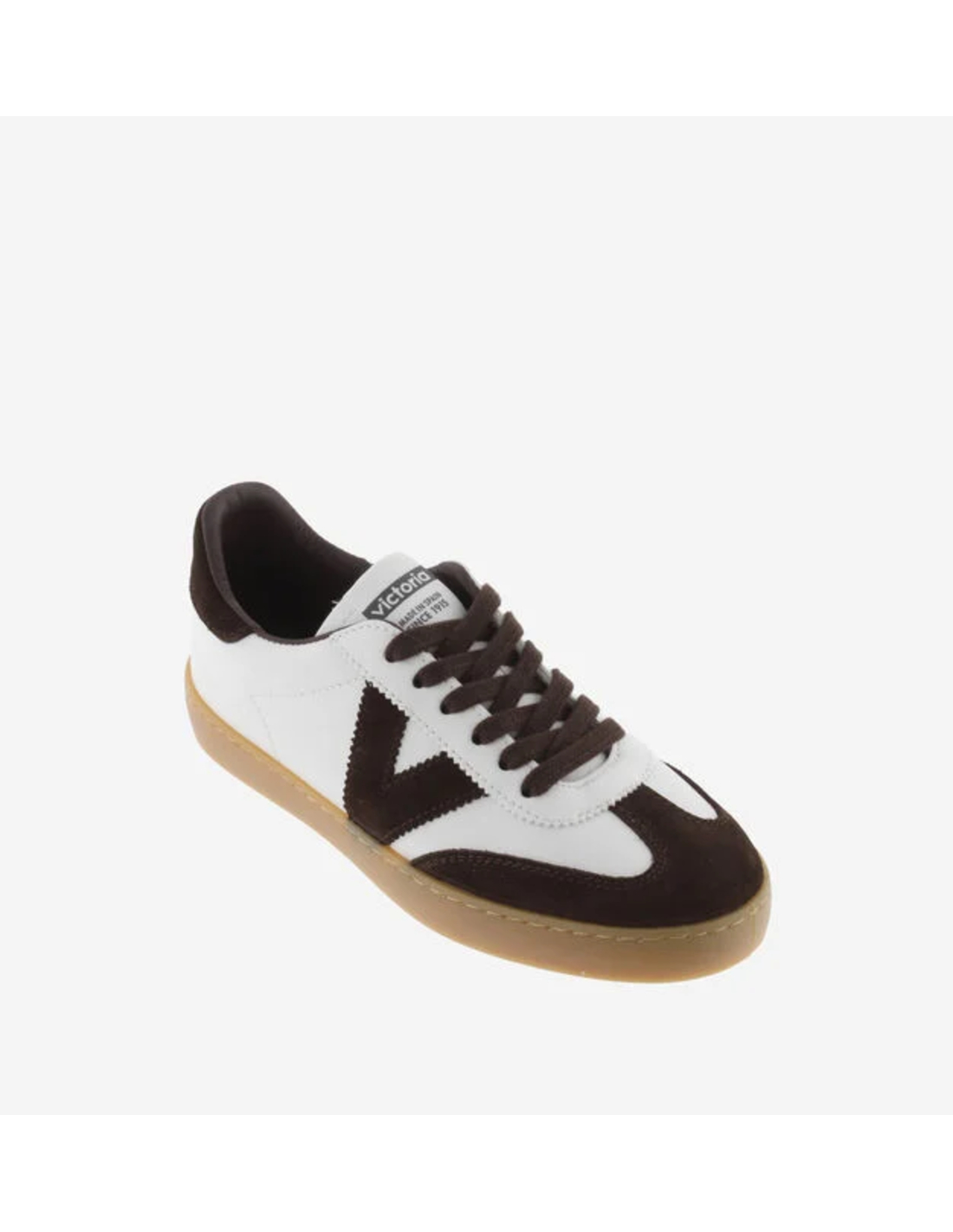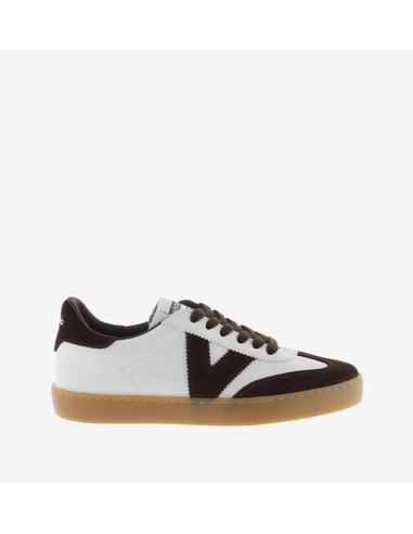 Zapatillas blancas unisex fabricadas en España en material efecto piel y piezas de serraje. Cierre mediante cordones al tono y nuevo corte ciclista en la puntera. Su suela traslúcida color caramelo aporta un toque de estilo retro. Además, incluyen una plantilla más ergonómica, confeccionada a partir de materiales reciclados, proporcionando un confort superior en cada paso.