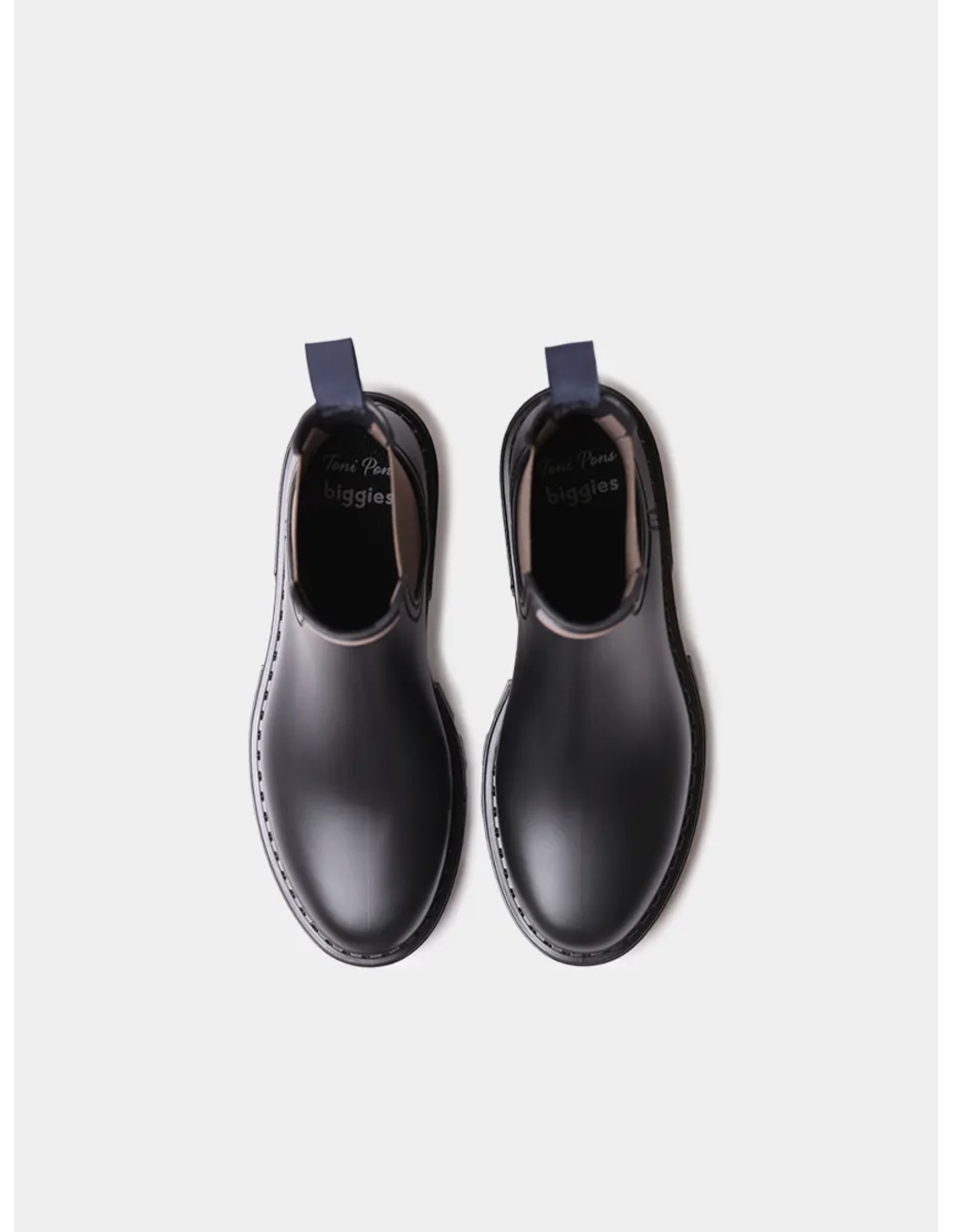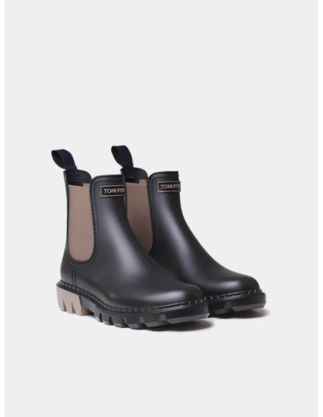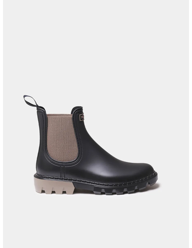 CAEN. Este botín de agua para mujer está disponible en colores fácilmente combinables. Los colores contrastados del talón y las gomas laterales le dan un toque original a este calzado. La base de la suela es de goma antideslizante y la plantilla interior está acolchada en tejido para mayor confort. La suela tiene una altura total de 3,5 cm.