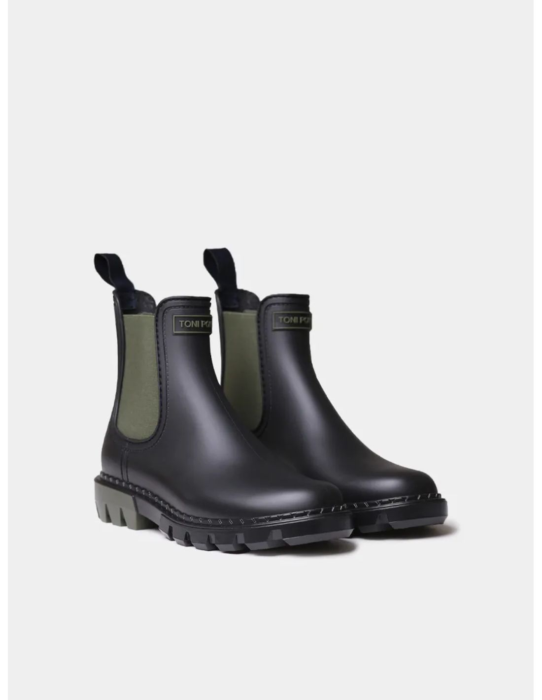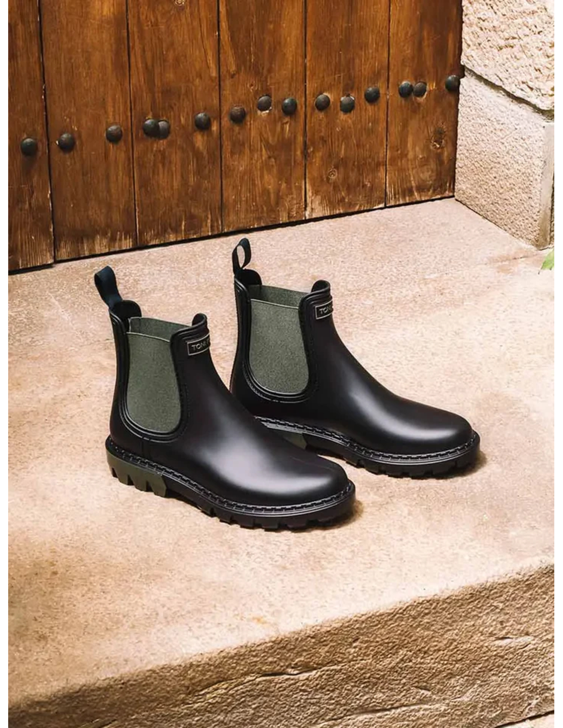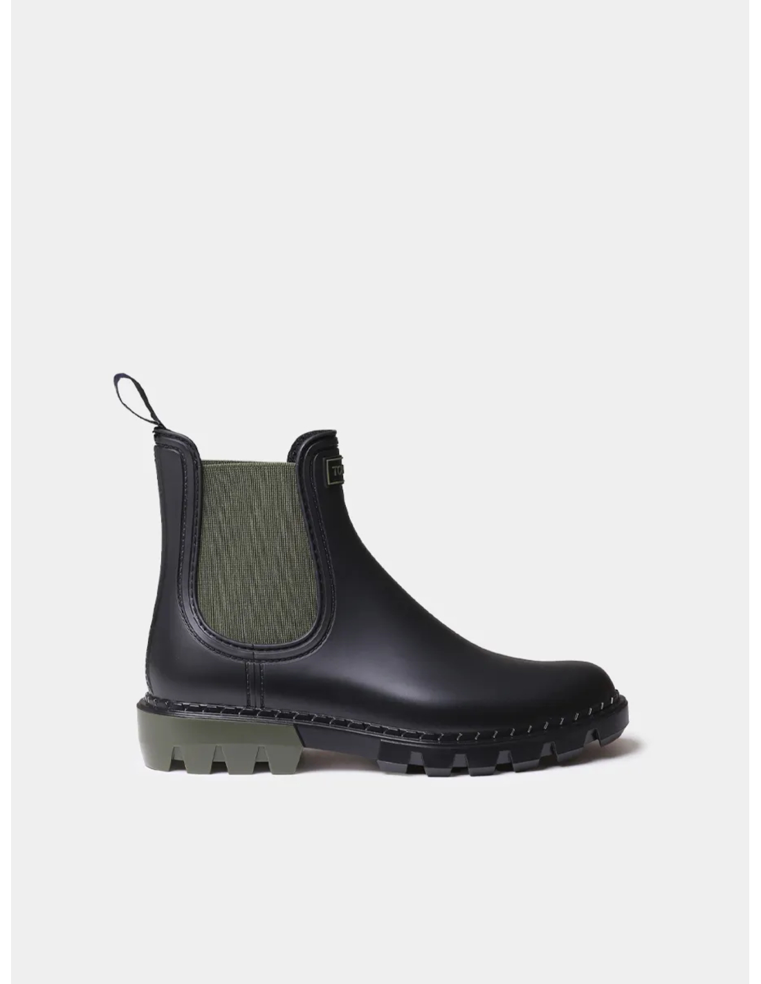 CAEN. Este botín de agua para mujer está disponible en colores fácilmente combinables. Los colores contrastados del talón y las gomas laterales le dan un toque original a este calzado. La base de la suela es de goma antideslizante y la plantilla interior está acolchada en tejido para mayor confort. La suela tiene una altura total de 3,5 cm.