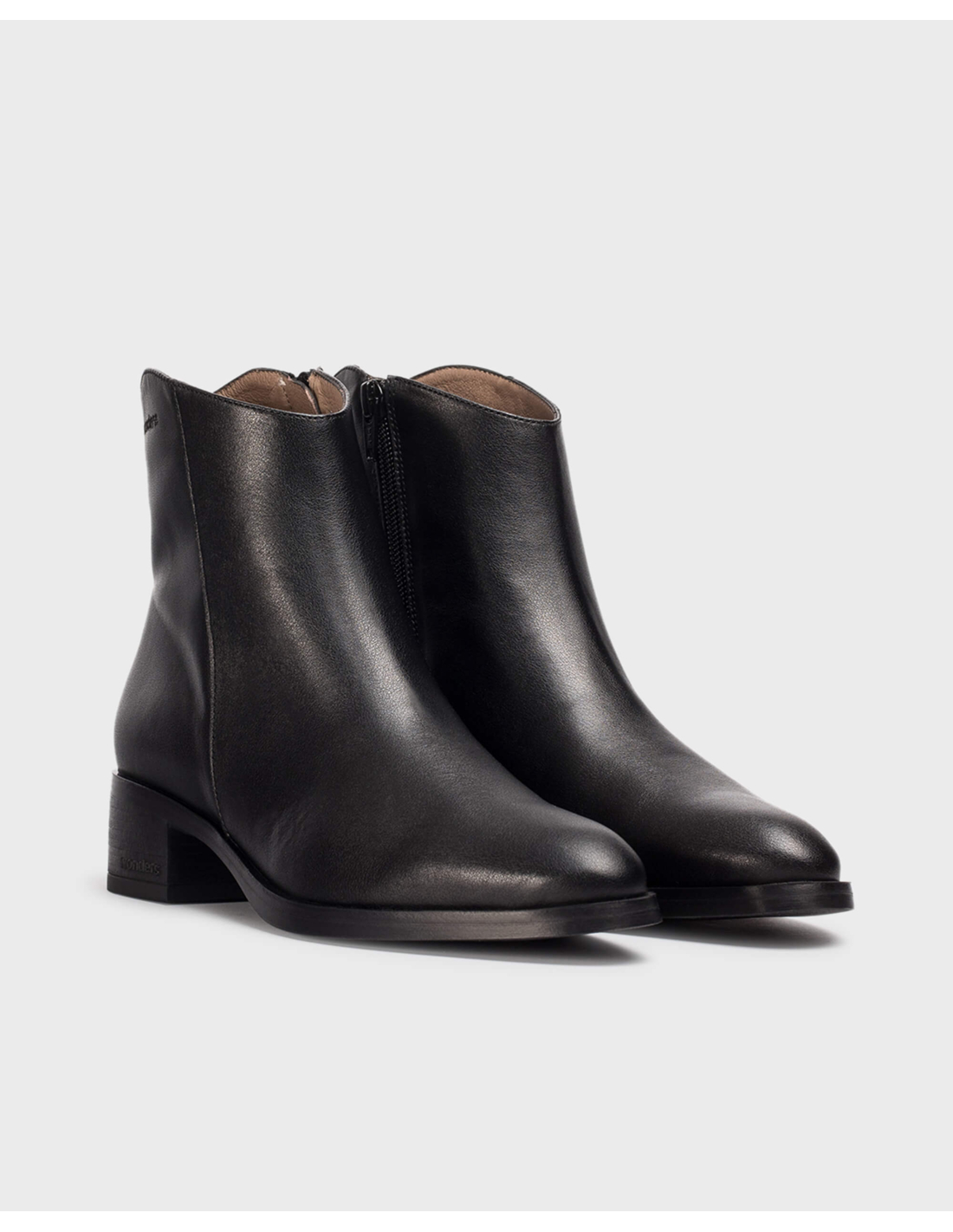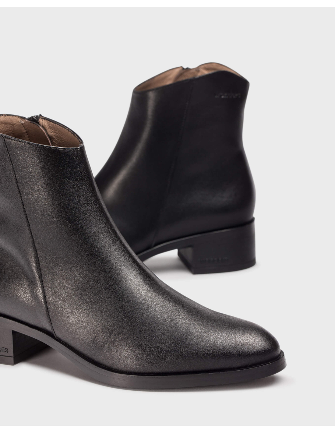 Botines BONJOUR 01 fabricados en piel lisa negra. Su estética limpia y atemporal lo convierte en un básico imprescindible para cualquier fondo de armario. De caña baja y punta redonda. Su cierre mediante cremallera lateral facilita el calce y asegura una sujeción cómoda durante todo el día. La plantilla interior de MemoryGel se adapta perfectamente al pie, proporcionando una comodidad excepcional en cada paso. Pruébalo ya!! #madewithloveinSpain Wonders apoya la fabricación responsable vía LEATHERWORKINGGROUP.