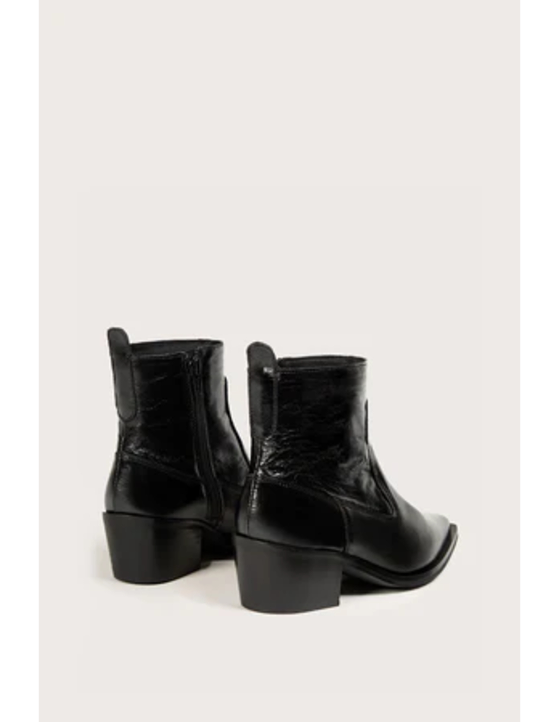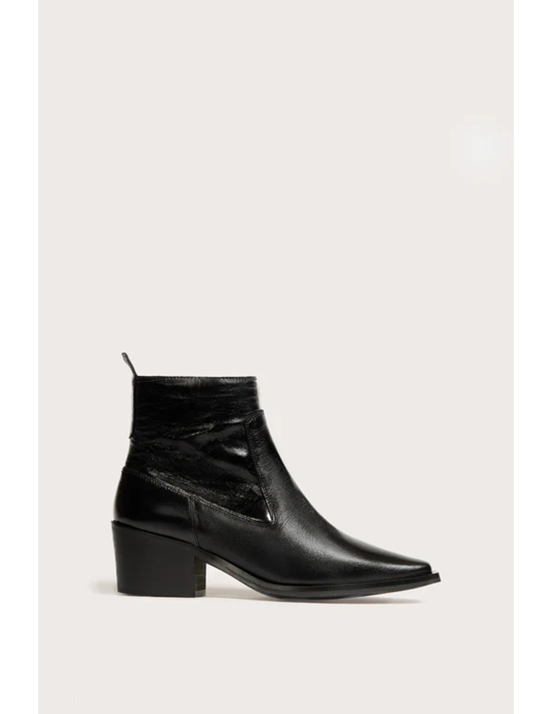 Botín de piel estilo cowboy con terminación en punta. Cierre mediante cremallera lateral.