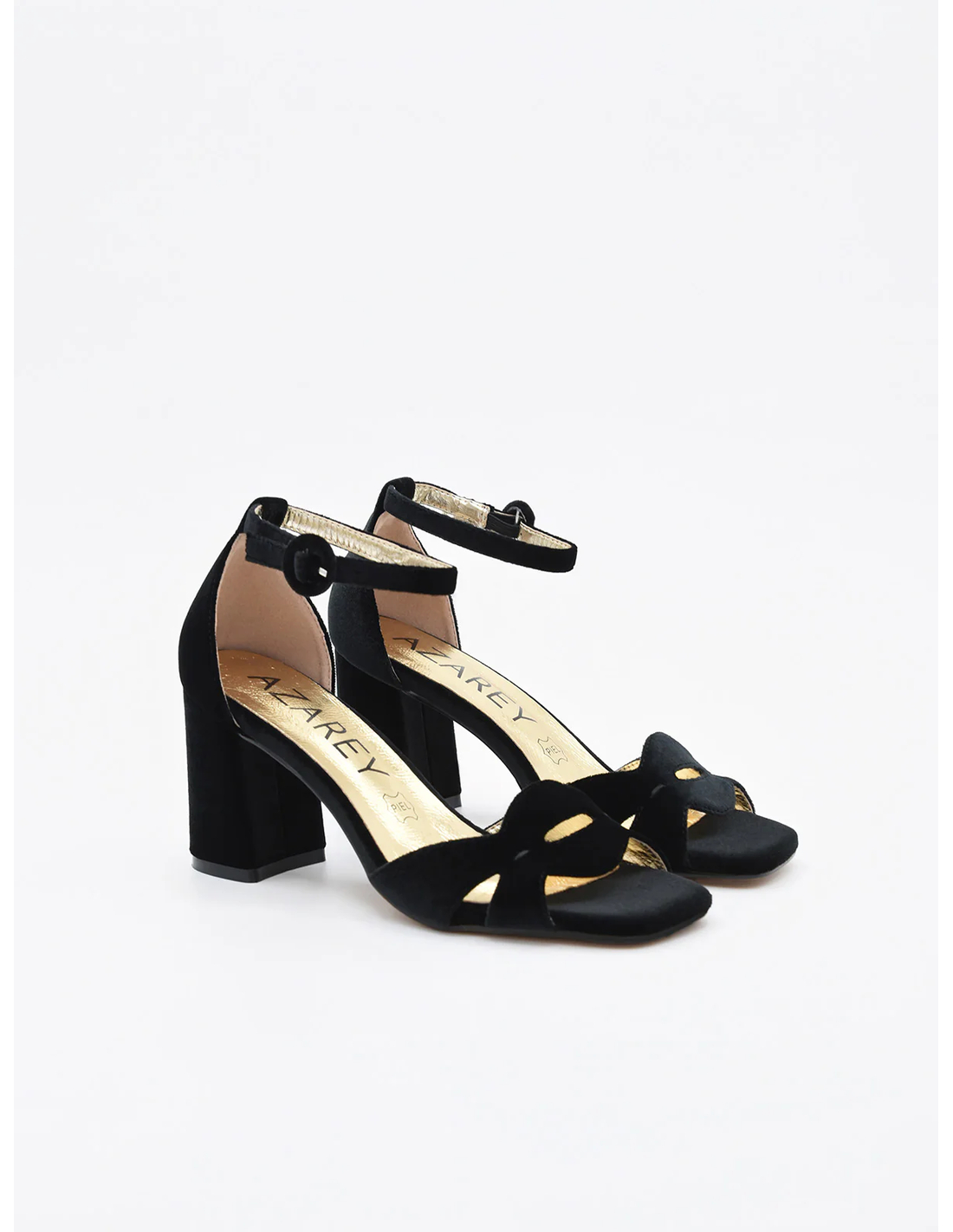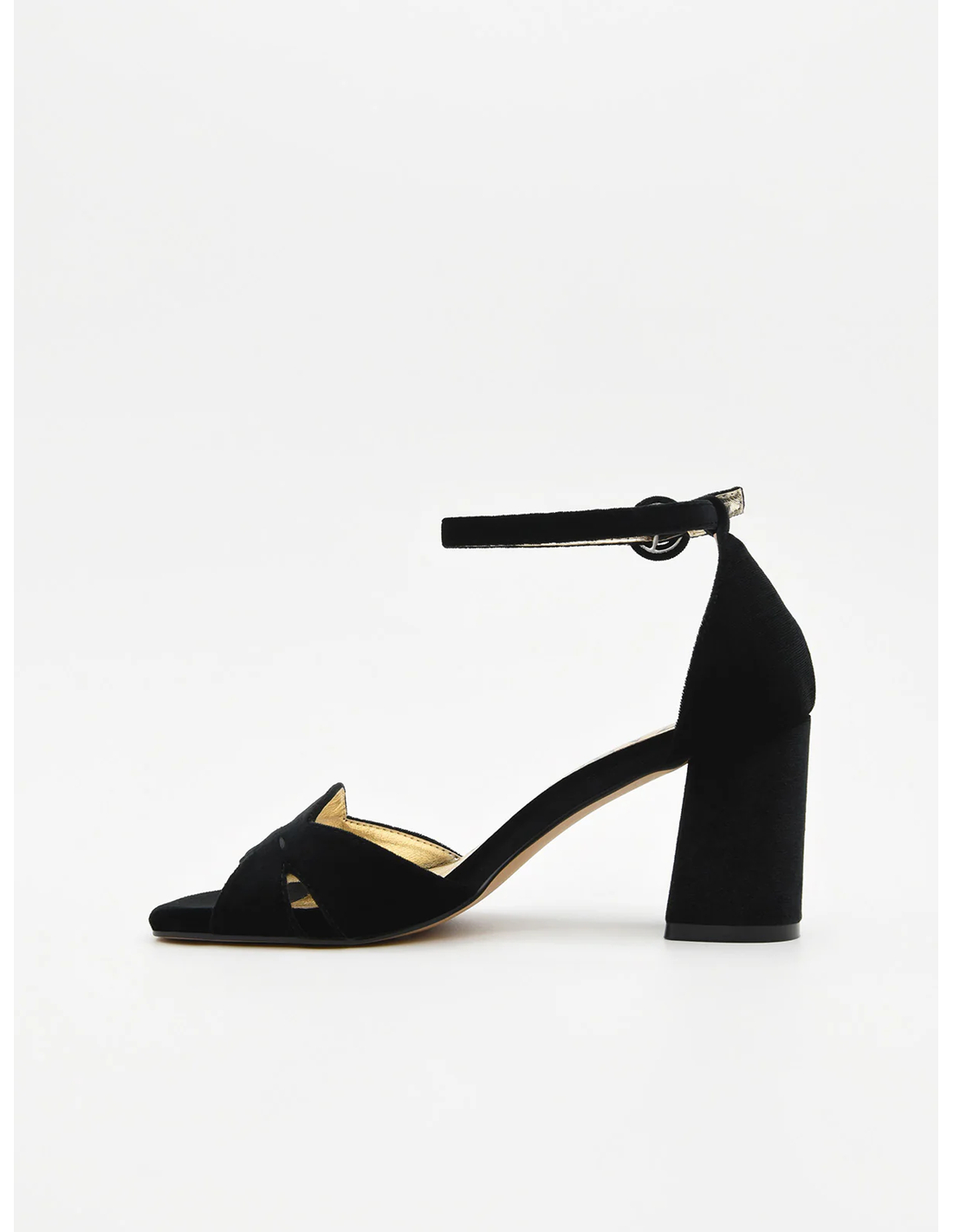 Esta sandalia de terciopelo negro combina elegancia atemporal y comodidad para que brilles en cualquier ocasión. Su tacón ancho ofrece estabilidad en cada paso, mientras que la pulsera al tobillo con cierre de botón forrado añade un toque sofisticado y asegura un ajuste perfecto. El diseño delantero, con un detalle calado en forma de lazo, aporta feminidad y estilo, realzando la delicadeza del pie. El terciopelo negro, suave y con un brillo sutil, la convierte en una pieza versátil que puedes llevar con vestidos de noche, trajes de dos piezas o incluso con unos vaqueros elegantes. Ideal para bodas, eventos especiales o cenas en las que quieras destacar con un look impecable y confortable