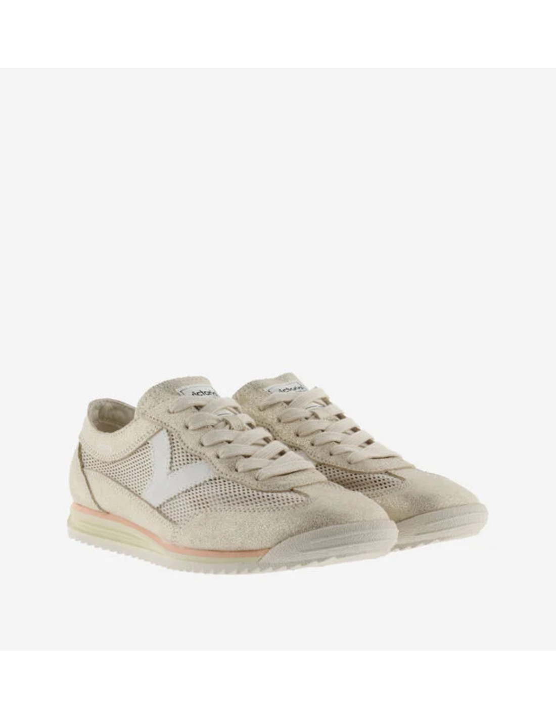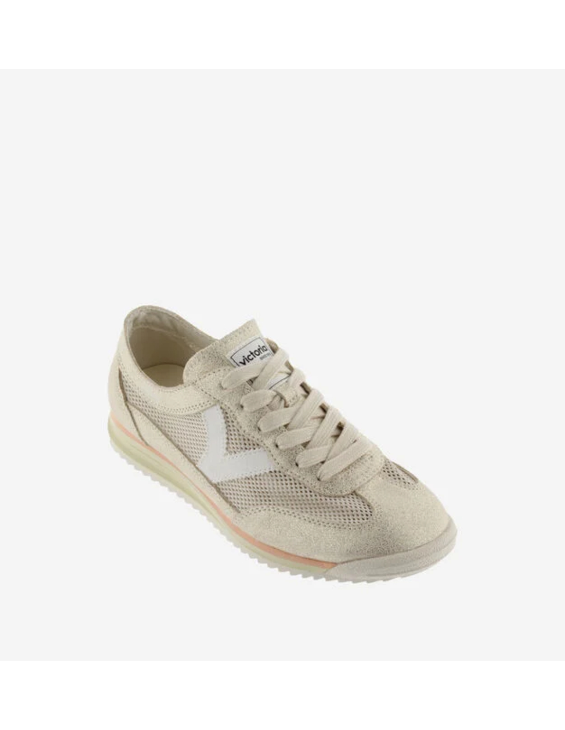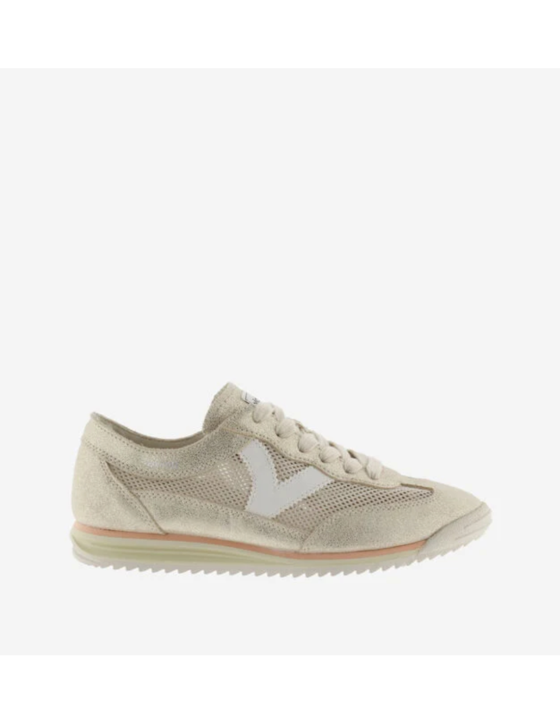 Sneakers para mujer fabricadas en tejido tipo malla con piezas superpuestas de serraje metalizado. V de victoria lateral en efecto piel blanca en contraste. Suela bicolor de goma con patín dentado de EVA en blanco.