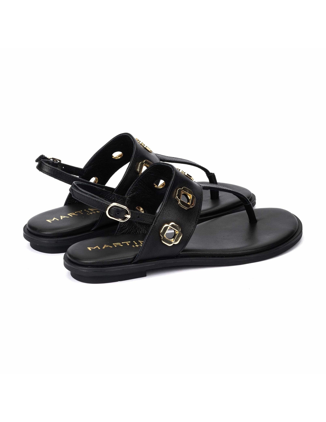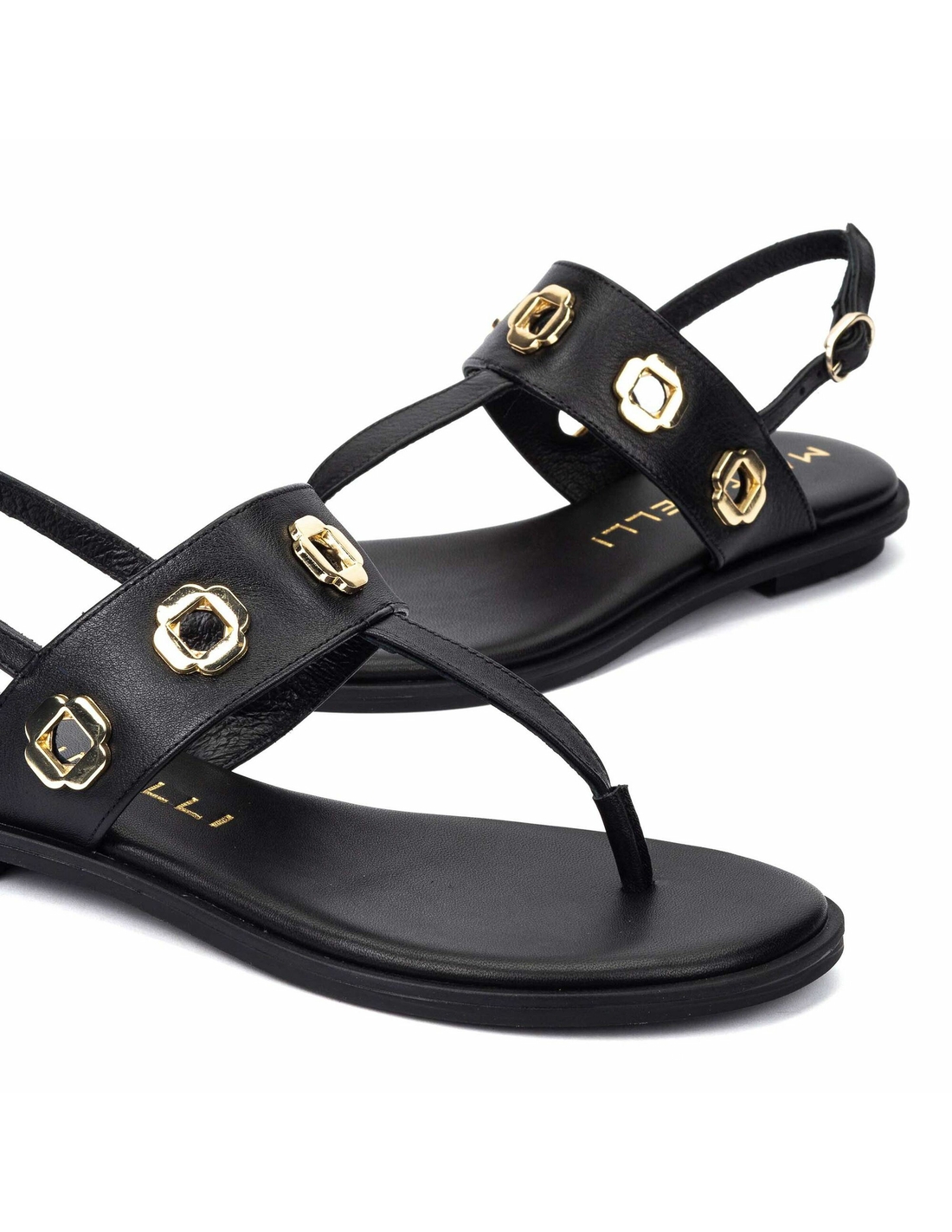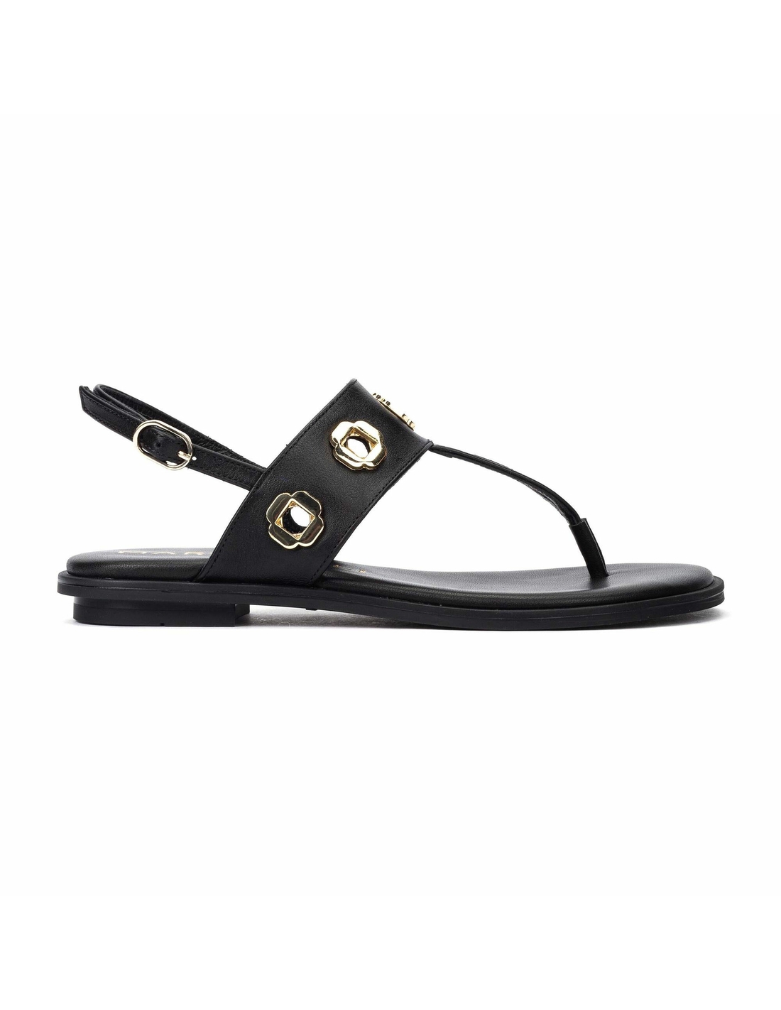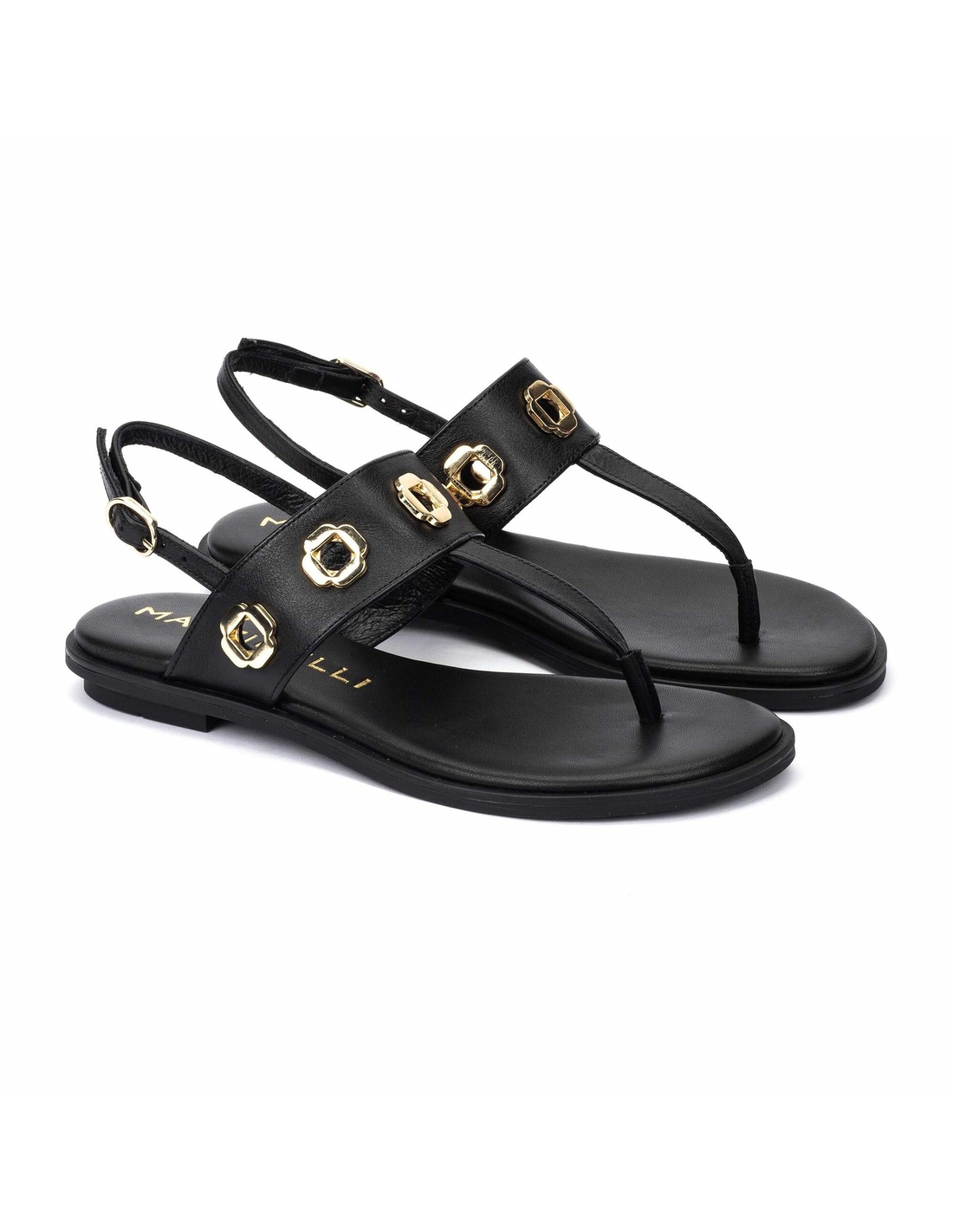 Sandalia plana Mazzini. Sandalia plana con tachas y hebillas, tacón redondo de 2 cm y punta redonda. Exprime el día a día con New Elegance, elegancia actualizada y comodidad.