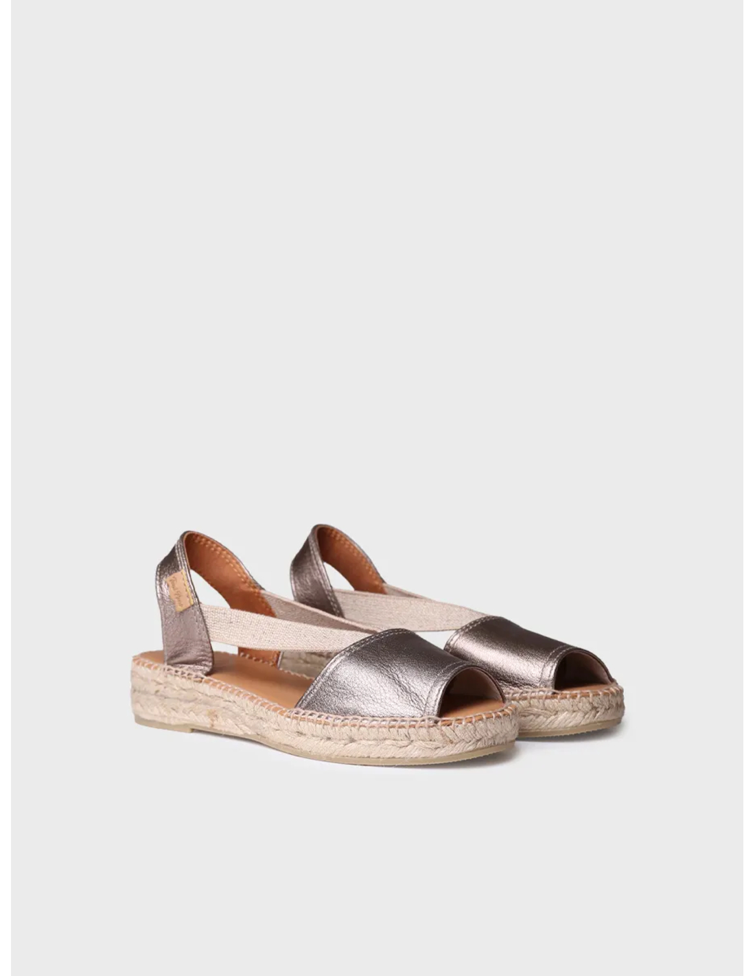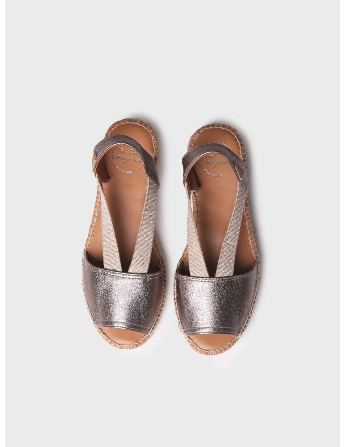 ETNA. Esta alpargata en piel para mujer se elabora en tonos lisos. La cuña de yute tiene una altura de 3,5 cm. La base de la suela está hecha de goma antideslizante. Cuenta con dos tiras elásticas laterales que dan una sujeción óptima al pie. La plantilla interior está forrada en piel para mayor comodidad. Este diseño está cosido a mano en España.
